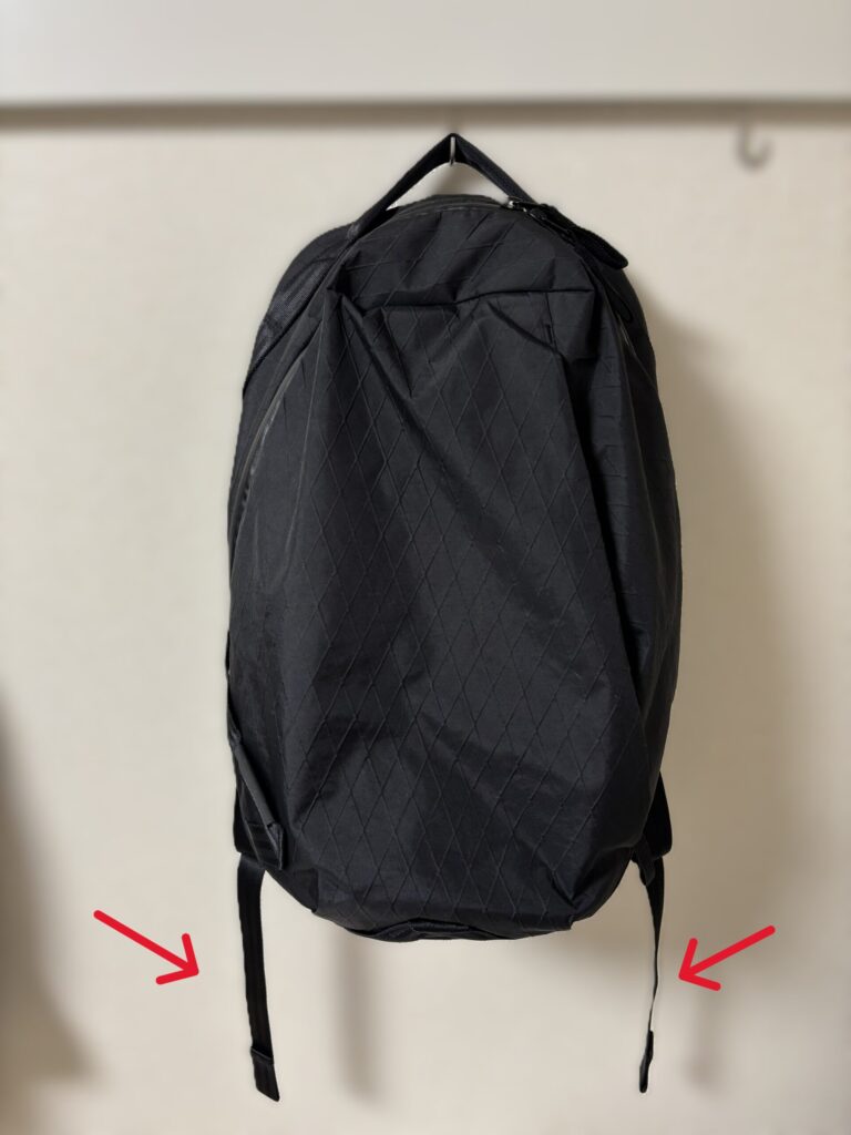 形状が常に一定で背負ったときの潰れがないのはメリットではあるが、ジムや銭湯に行った際に小さいロッカーだとバックパック自体をロッカーへ収納するのに苦労する。