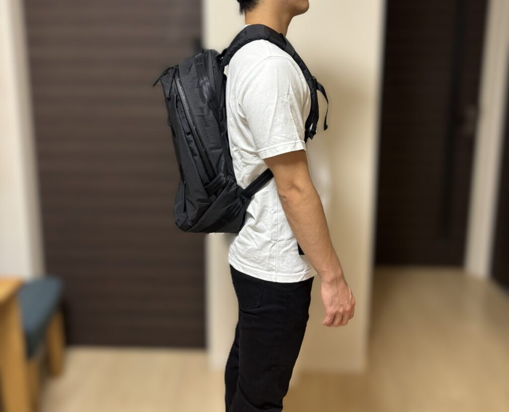 基本的には胸のチェストストラップをしっかりと締め身体に密着させることでこのバックパックの恩恵を最大に享受できるが、どうしてもチェストストラップを締めると登山感が出てしまうのが少し難点。