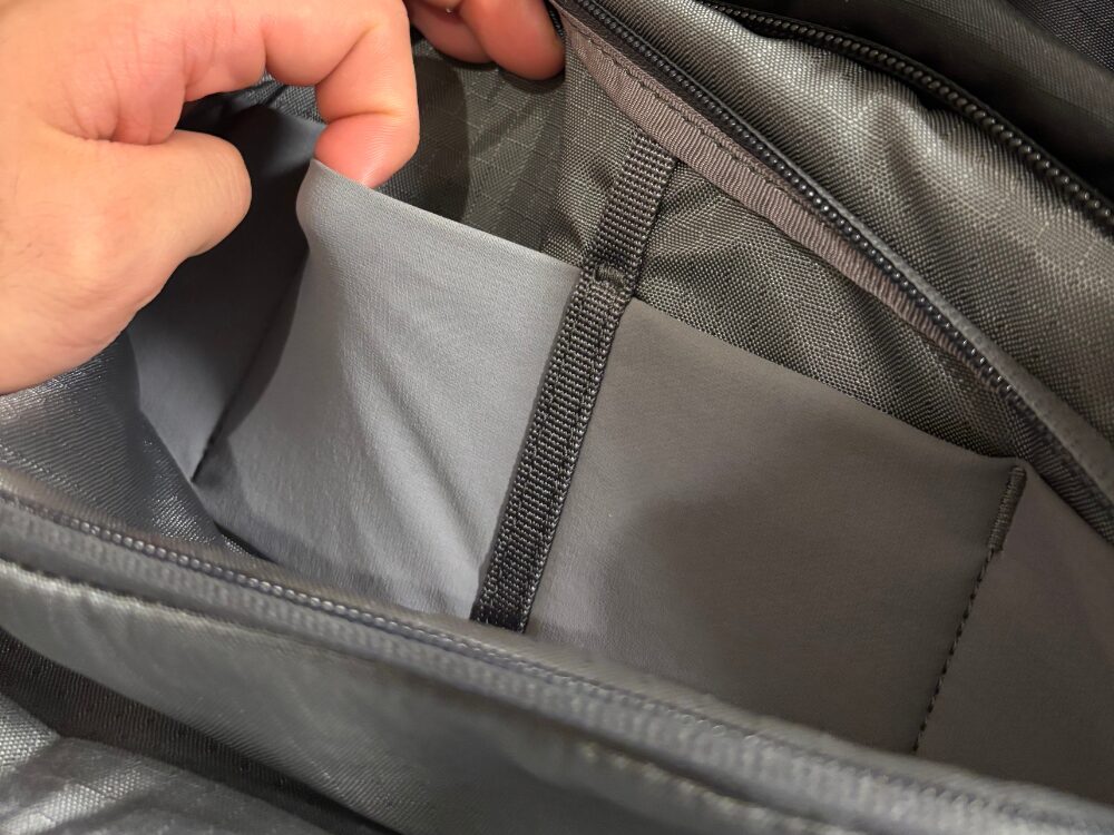 ここの素材は伸縮性があるので小物を入れやすい仕様になってます。筆者はCIOの充電器を入れるのに使ってました。