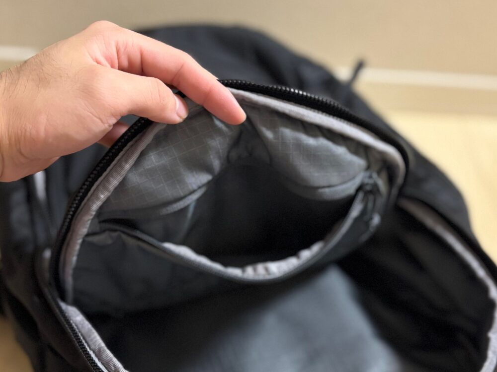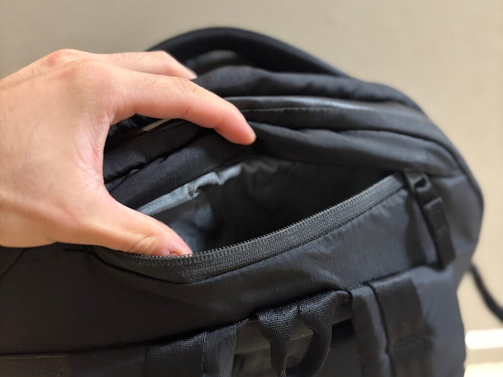 これはDailyPlusにもあってとても便利な背面隠しポケットです。財布やカードなどの貴重品を収納するのに使っています。背負ったときにちょうど首の後ろに位置するのでスリに遭う心配がない安心感。
