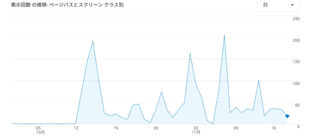 PV数の推移を見てみると安定しておらず上下に振れていることがわかります。たまにスパイク(急にPVが増えている箇所)しているのは記事のリライトをしたタイミングと重なります。記事のリライトをするとPV数が上がるということが分かるので定期的な記事のリライトは必須かと思います。