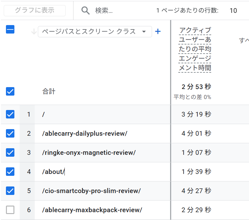 ページレポートを見ると、/ablecarry-〜 や /cio-smartcoby-〜 など一部のレビュー記事にPVが集中していて、下位のページは表示回数がかなり少ないものも多い。当たっている記事はあるけどそれ以外の記事が埋もれている状態。