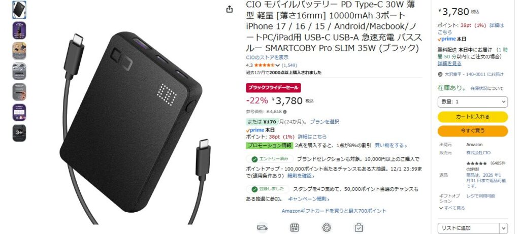 10,000mAhクラスのモバイルバッテリーとしては定価5,000円弱は少し高め。とはいえAmazonセールで4,000円弱になるので買うならセール時ですね。