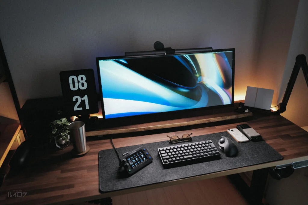こちらのブロガー様もデスクは木目調。少し濃いめの木目で黒をメインにしたこだわりのモノがデスク上に配置されていますね。メインのモニタが大きく作業がしやすそう。ライトがランタンのような形状なのもこだわりが詰まってますね。大人な感じがしてとても好きです。
