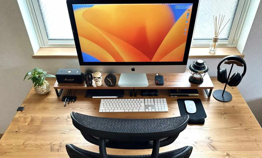 こちらのブロガー様も木目基調のナチュラルなデスク空間。ちょうど窓の前にデスクを持ってきて自然な光でデスクが綺麗に見えますね。スターウォーズのグッズなど自分の好きなモノを置いて遊び心を出しつつこちらもデスクシェルフでスッキリとさせています。PC関連はキーボードとマウスでどれもApple純正?なのでまとまりが良く見えますね。