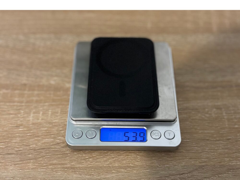重さは約54gで単体だとそこまで重さは感じません。実際にスマホに接着したとき女性だと少し重たく感じることがあるかもしれません。個人的には特に重さは気になってませんね。