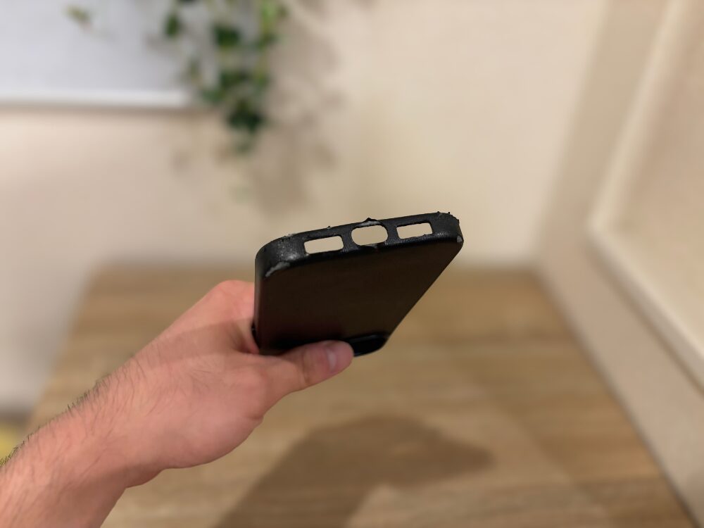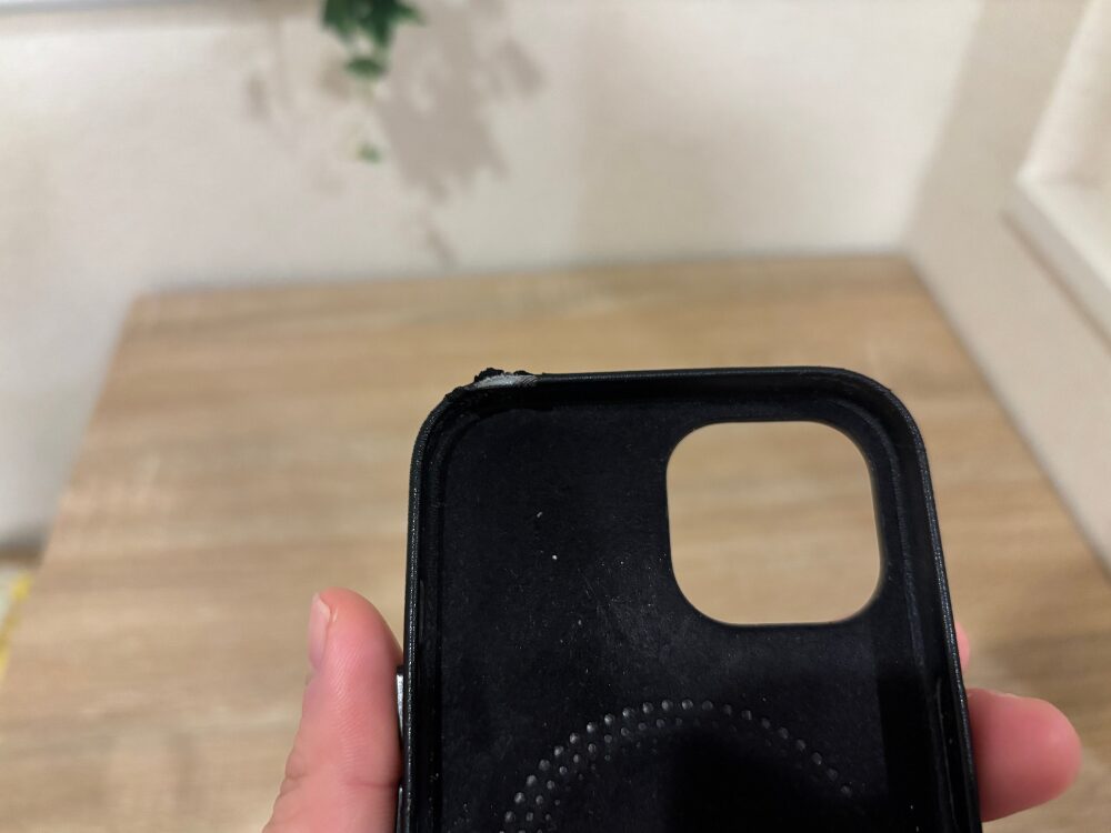 底の部分はこんな感じ。ヴィーガンレザーが剥がれてきているのが確認できます。落としたりすると剥がれてしまうのは仕方ないですね。その分中のiPhoneへのダメージは全くないので衝撃吸収性能はしっかりしていると思います。