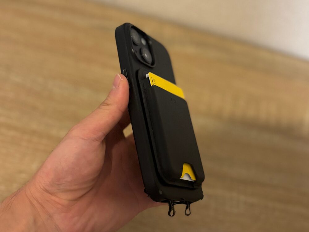 MagSafeのマグネット力は可もなく不可もなく。やはり直接装着するよりは横に対する力には弱くなりますが、ESRのカードケースをMagSafeでくっつけて外れたことはありません。