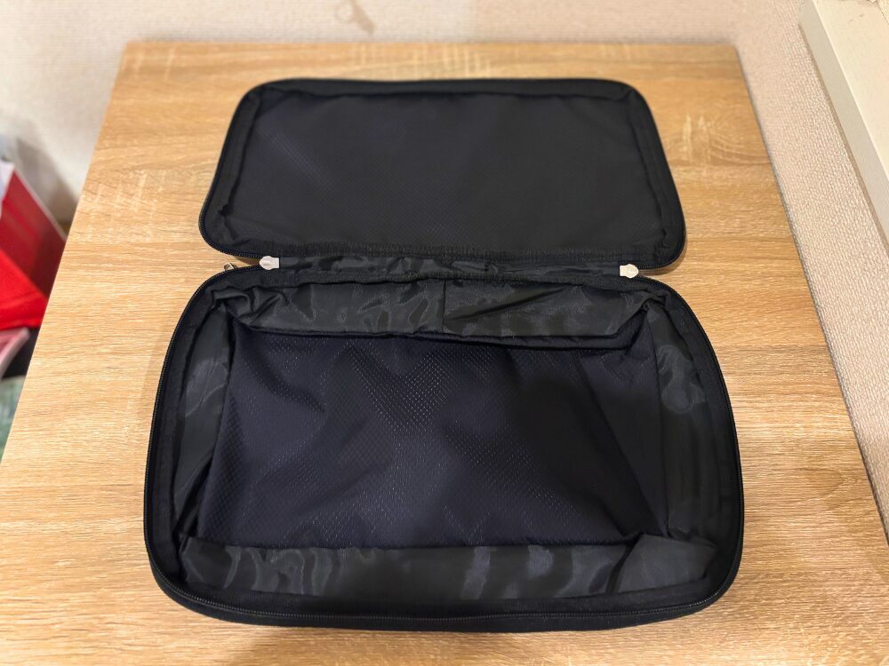 内部には細かい仕切りが多数あり、充電器、イヤホン、さらには先ほど紹介した「SMARTCOBY Pro SLIM」などのガジェット類を、定位置に美しく収納できます。底まで大きく開くジッパーのおかげで、視認性が高く、カバンの底を探るストレスがありません。