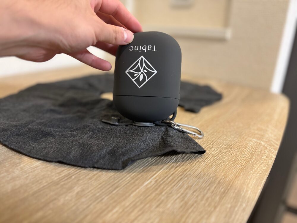 使い終わったらバルブを開けて一気に排気。付属のポーチに収納すれば、リンゴ1個分ほどのサイズに。バックパックのサイドポケットや、スリングバッグの隅にスッと収まる圧倒的な携帯性です。