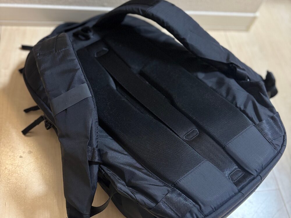 バッグの底からストラップへと繋がる独自の「A字型フレーム」が、荷物の重さを効率よく分散。30Lという大容量にPCや着替えをパンパンに詰めても、背中に吸い付くようなフィット感で、実際の重量よりも驚くほど軽く感じます。
